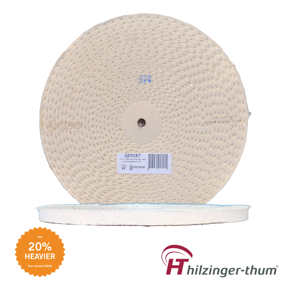 To achieve a beautiful mirror finish, metal (like any material) needs to be prepared by cutting down the surface to level out highs and lows. Deep scratches diffuse light and reduce your clarity; cut them out with coarse cutting compounds and firm buffing wheels that enhance the cut-down effect! Sporting Hilzinger’s special heavy weight 86/82 cloth, these buffs delivers sustained, smooth cutting action throughout the buff’s life and enhanced buffing efficiency through a 20% weight advantage over standard 86/82 material. Stitching provides firmness for enhanced cut with less hash thanks to untreated material.