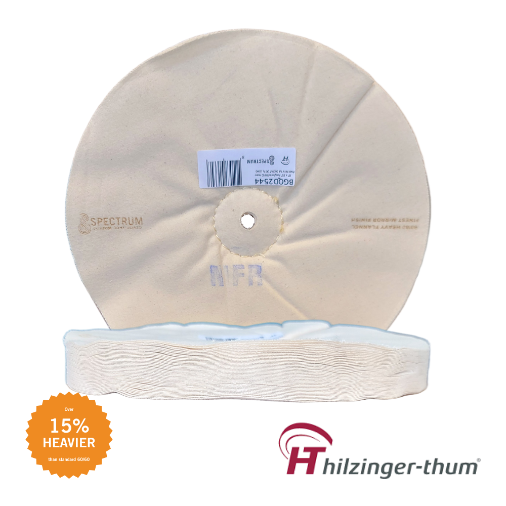 After a long wait, we're proud to introduce Spectrum Professional Series buffing wheels made by Hilzinger-Thum. These buffing wheels sport higher grades of raw material than are regularly available in North America; though they come at a greater cost, they more than make up for it through enhanced durability, efficiency, and - most importantly - finer finishes in less time/fewer steps. Please note that the cotton used in these buffs tends to hold compound much better than domestic fabrics - as a result, particularly after a break-in period, it's easier to accidentally overload your compound. A little goes a long way!