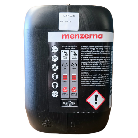 Precautions: Contains petroleum distillates, hydrocarbons, and alcohols; wear appropriate safety clothing and respiratory protection if work area is not well ventilated. Can cause serious eye irritation if directly exposed. Keep in mind that polishing automotive paint necessarily removes small amounts of material from your clear coat. Menzerna paint polishes are professional products capable of removing significant amounts of surface material; misuse could lead to burnt paint or you polishing entirely through your clear coat. Use your least aggressive polishes, pads, and machines first unless you are very familiar with your work surface, tools, and these products.