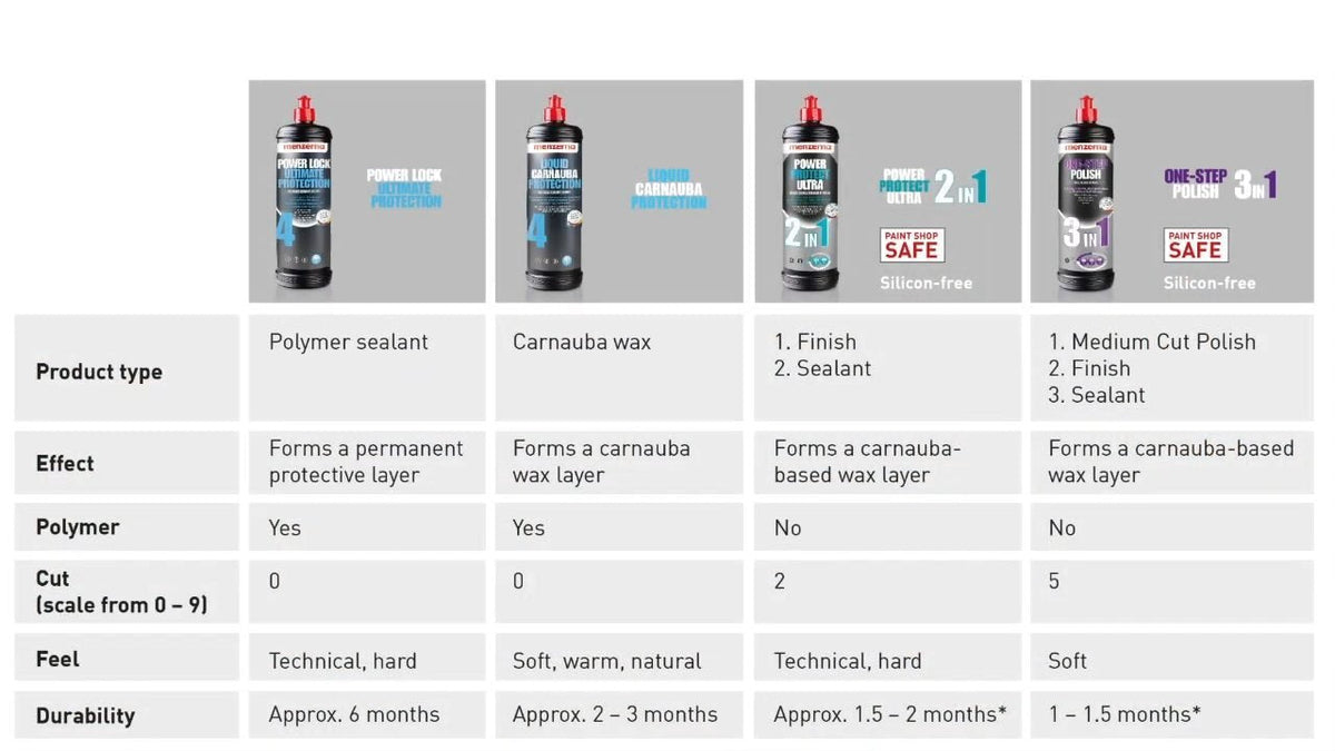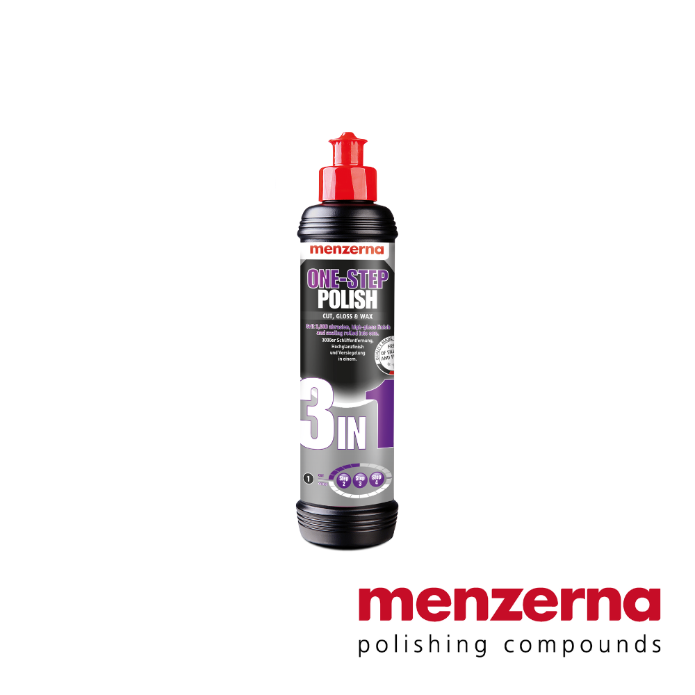 Menzerna's premium all-rounder in top form: One-Step Polish 3-in-1 cuts out 3000 grit sanding marks, reliably removes streaks, swirls and clouding, and provides lasting protection for your high-gloss, finished surface. As a result, Menzerna 3-in-1 shines with ease and speed, making it ideal for professional detailers, automotive dealers, and body shops. Wax lasts up to one-and-a-half (1.5) months.